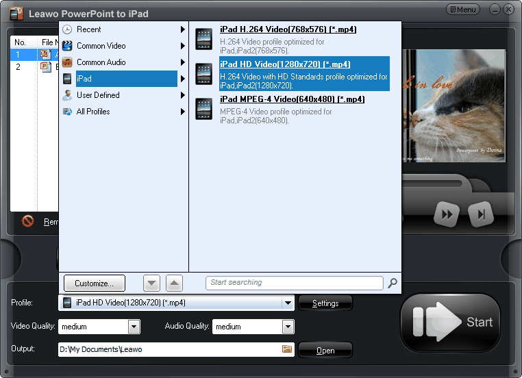 2000 character description: Leawo PowerPoint to iPad is designed for the tablet computer, iPad. Beyond what the name suggests, this PowerPoint to video converter can convert PowerPoint files to iPhone and iPod Touch video like MP4, MOV for sharing with iPhone and iPod Touch, as well as iPad. KEY FEATURES of Leawo PowerPoint to iPad: Support various video output formats, including MOV Video (*.mov), MPEG-4 Video (*.mp4), MP4 AVC (*.mp4), iPad HD Video (*.mp4), iPad Video H.264 (*.mp4), iPad Video MPEG-4 (*.mp4), making it suitable for iPad, iPhone and iPod Touch. In addition, user-defined output formats are also supported. Compatible with PowerPoint 2010 - Support all PowerPoint verions including PowerPoint 2000/2003/2007/2010 and PowerPoint Viewer 2007/2010. Satisfy with the needs of the majority of customers using different PowerPoint versions. Up to 12 PowerPoint files can be processed to separate video files for each input PowerPoint file per conversion. The input file formats include *.ppt, *.pps, *.pot, *.pptx, *.ppsx, *.potx, etc. Multi-lingual Graphic User Interface - Set with a neat GUI in seven languages, i.e. English, French, German, Italian, Japanese, Simplified and Traditional Chinese, which is convenient for you to undertake operation. Keep everything from original PowerPoint to output video, particularly dynamic effects like music, flash, movie clips from a selected PowerPoint file to final video. You can modify the video settings in the Profile. The Music feature allows you to add a sound or record your voice for the video slideshow. You can insert as many soundtracks as you like. Besides, you can also add your own watermark to protect your copyright or for advertisement. Benefiting from batch conversion and accurate codec for PowerPoint, the PowerPoint to iPad converter lets you make the best use of your multi-core processor power. Choose to preview the output video real-time with a single click.